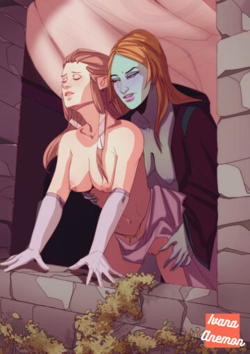 414105 BoobsHentai Boobs – 2 girls arm support bangs bare shoulders breasts brown hair castle closed eyes by Belver