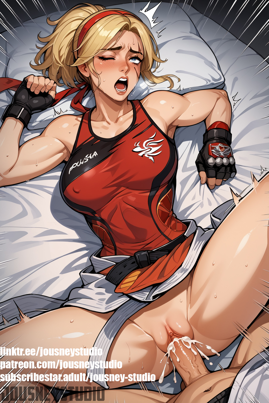 415106 Blonde HairHentai Blonde – 1boy 1girl abs ai-created ai generated armpits bandai namco bed bed sheet belt by JKF